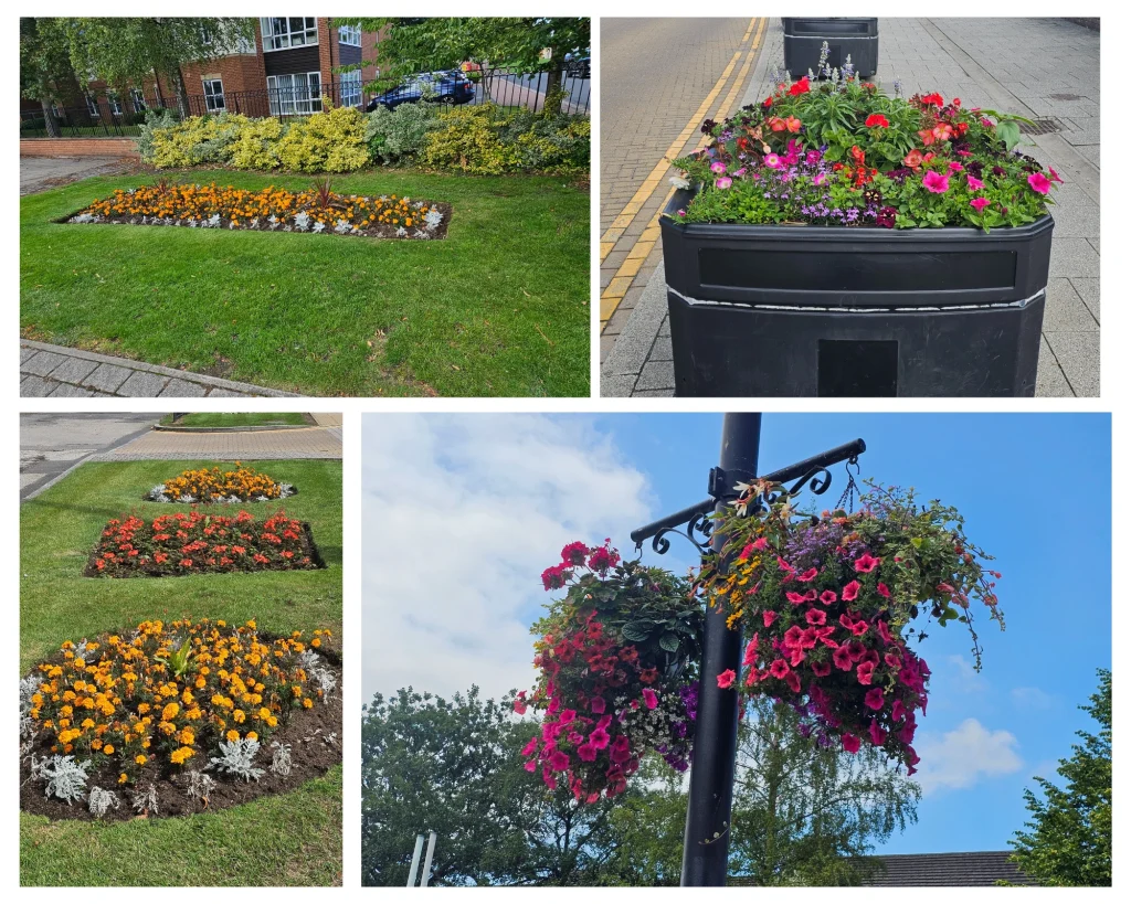 - Flower beds – carefully planted and maintained to provide seasonal colour and support local biodiversity.